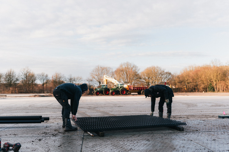 Komende week start de kerstvakantie, maar juist in deze periode wordt er keihard doorgewerkt. Op maandag 22 en dinsdag 23 december draaien in totaal 24 vrachtwagens de Haersterveerweg op om de graszoden te leveren voor het eerste veld. Met rollen van 2.40 meter breed en 15 meter lang is dat een enorme klus waar logischerwijs ook enorm naar wordt uitgekeken.