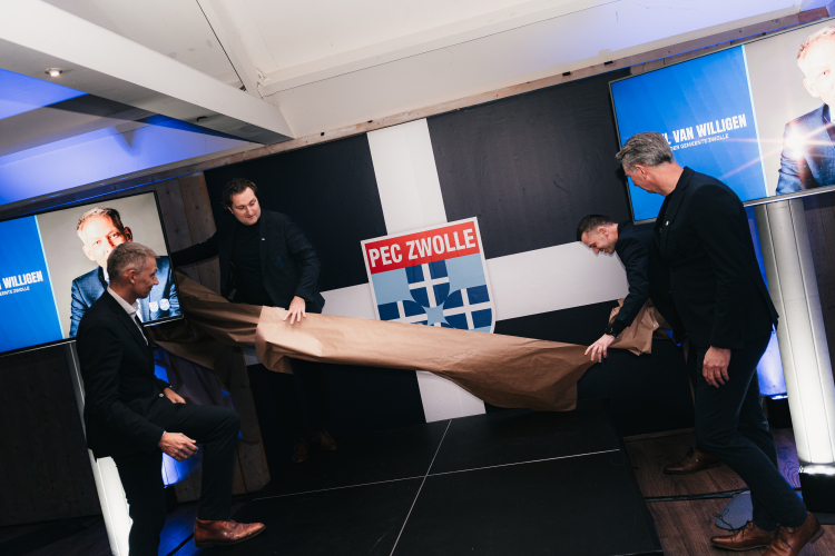 De bijeenkomst werd afgesloten met een symbolische onthulling, waardoor het eerste PEC-logo nu zichtbaar is op De Pelikaan.